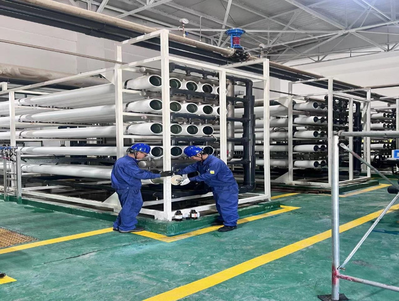 一号一级反渗透设备从今年4月开始,就出现除盐率下降的现象,经过探针实验分析膜柱故障,在对调更换一二号反渗透膜柱没有明显效果后,确认膜柱除盐率降低。由于相关备件停机时间等因素,机务检修人员没有机会处理该故障。8月2日该装置具备临时停机检修条件,技术装备部主动联系处理该故障,计划用仅有的四天将126支膜柱从高3米长6米的21组膜壳中取出、处理故障及新膜柱的编号登记安装恢复和调试。虽然“时间短、任务重”,但为了确保不影响装置开工,公司领导高度重视并要求加快检修进度,力争在3天后进行调试试运行。面对紧迫的工作任务,机务检修班的员工们尽显担当,顶着作业环境高温潮湿,在检修现场进行高强度作业,闷热的环境让每个人汗如雨下,主动加班加点投身到检修工作中,最终如期并保质保量的对设备进行了恢复。此次检修,赢得了运行人员的一致好评。