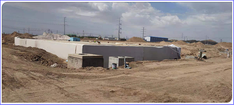 废水处理站由初期雨水池(有效容积490m³)和事故水池(有效容积1715m³)组成。池壁、底板、顶板通过三层长丝无纺土工布,两层土HDPE土工膜做防腐防渗处理。水池注水至雨水池和事故水池连接处,沉降观测一周,池主体无渗漏后用潜水泵抽水放至现场。水池闭水过程严格按照闭水方案进行,并制定了防水现场应急处置措施。