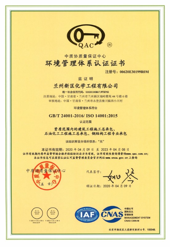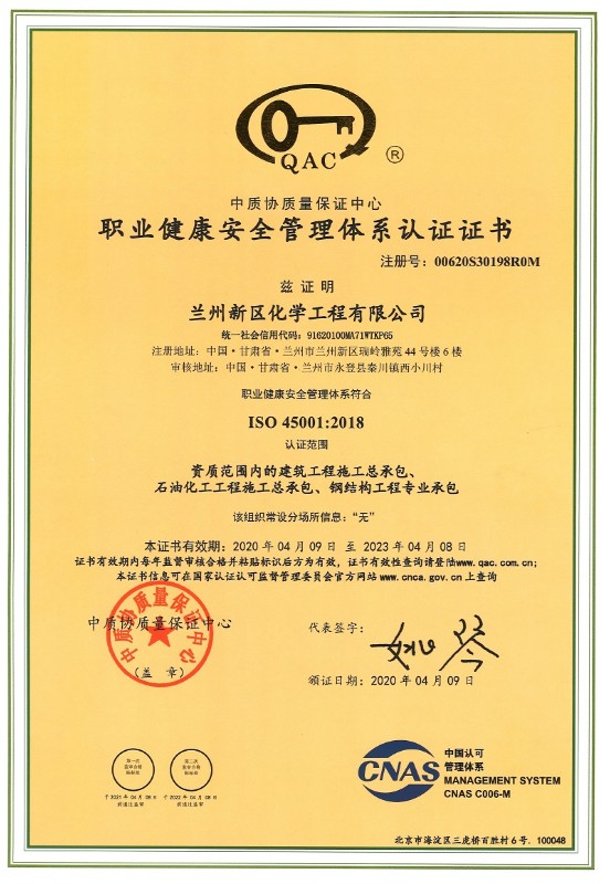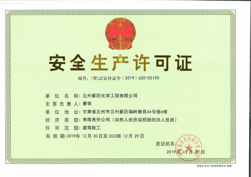 兰州新区化学工程Beat365唯一官方网站目前已取得了石油化工总承包三级、建筑工程总承包三级、钢结构专业承包三级、地基处理专项承包三级资质。