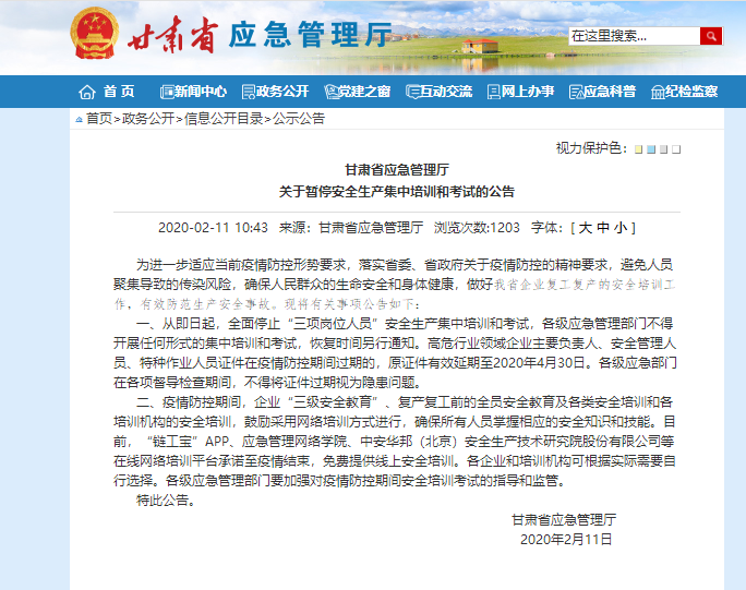 为全面落实疫情防控和安全培训工作要求,兰州新区化学工程有限公司培训中心结合疫情防控和复产复工实际,根据甘肃省应急管理厅2月11日发布的《关于暂停安全生产集中培训和考试的公告》相关要求,在疫情期间免费为新区企业提供线上复工复产专题安全培训。