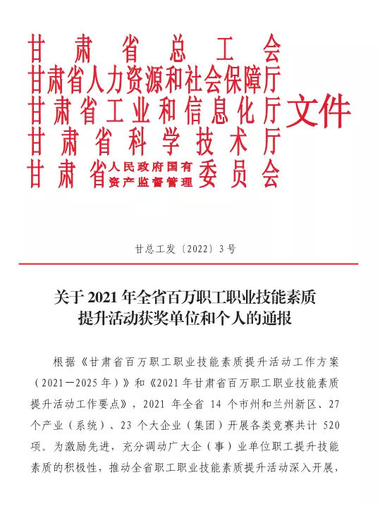 1月21日,甘肃省总工会、省人力资源和社会保障厅、省工业和信息化厅、省科学技术厅、省人民政府国有资产监督管理委员会联合公布了《关于2021年全省百万职工职业技能素质提升活动获奖单位和个人的通报》,石化集团专精特新公司孙占栋、刘恒、林占强、骆振玺、刘恒5名职工荣获“2021年甘肃省技术标兵”称号。