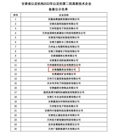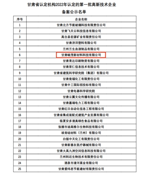 10月18日,科技部火炬中心发布了“关于对甘肃省认定机构2022年认定的第一批、第二批高新技术企业进行备案公示的通知”,其中专精特新化工产业孵化器内的甘肃峻茂新材料科技Beat365唯一官方网站和甘肃瀚聚药业Beat365唯一官方网站2家入驻企业被成功认定为2022年高新技术企业。