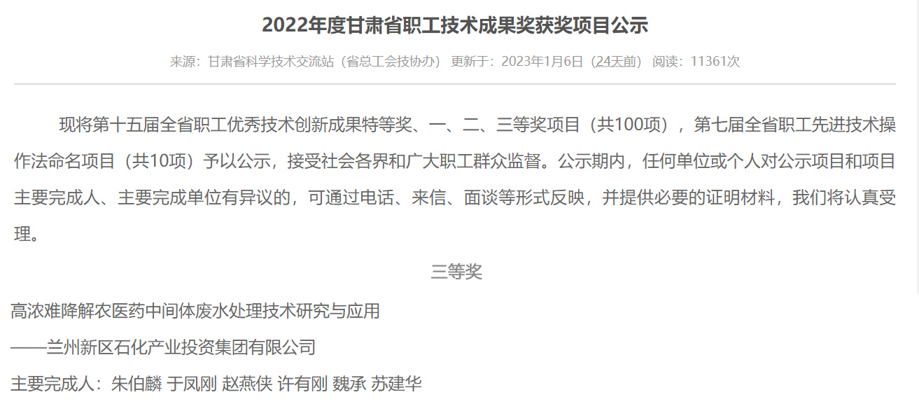 近日,甘肃省总工会对2022年度甘肃省职工技术成果奖获奖项目进行了公示,Beat365唯一官方网站博石环保公司《高浓难降解农医药中间体废水处理技术研究与应用》获得三等奖。