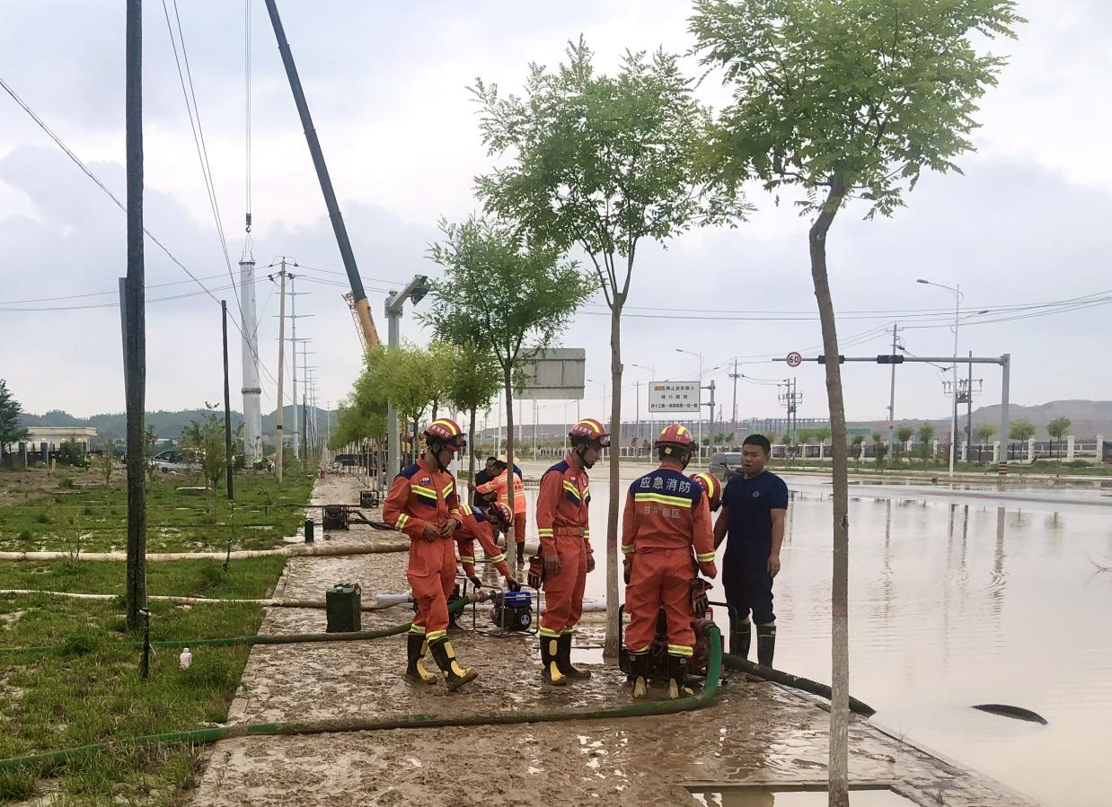 面对这一紧急情况,石化集团久泰服务公司迅速联合秦川园区消防队展开抢险救援行动,此次应急救援队伍共计人力108人,清扫车2辆,水车4辆,消防车2辆,水泵5台,处理路面积水区域 8 处,累计抽水900余方,对 6 处路面淤泥进行了清理,并成功恢复车辆通行道路 3 处。