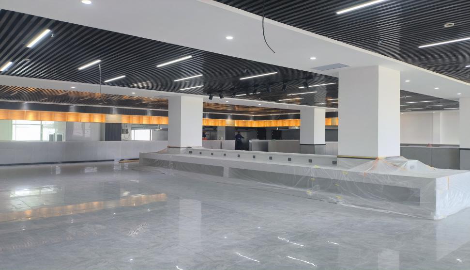 截至目前,已经完成辅助楼装饰装修分部工程中的地面地砖、后厨及卫生间墙砖、内墙抹灰、室内吊顶、后厨轻质隔墙、门窗安装、饰面施工、灯具安装等子分部工程,施工过程中我方与业主单位保持密切沟通,从实际使用角度出发,对施工中的重点、难点进行技术研讨和技术分析,及时确定施工方案、施工措施,对设计中不合理地方及时提出修改建议,在施工过程中采用最优施工方案,使项目竣工后能发挥最大经济效益。